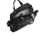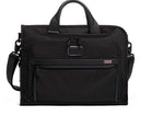 This slim briefcase is from TUMI's alpha 3 collection and is made of strong ballistic nylon. There is easy access to the main compartment via the zipper opening in one corner of the bag and the interior of the bag also offers space for pens, A4 papers, business cards etc. The bag can be pulled over the telescopic handle of most suitcases.